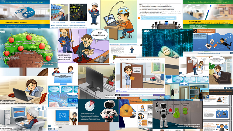 Курсы, квизы, тесты различного формата, видео, плакаты, заставки, скринсейверы, памятки, игры, дайджесты по ИБ и многое другое в соответствии с вашими требованиями. Доступный индпошив.